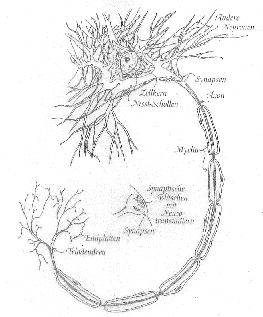 Man kann sich diesen Prozess wie die Elektrik in einem Haus vorstellen. Auch wir haben Stromkabel (= Nervenzellen), von denen mehrere in einem Kabelschlauch (= Nervenstrang) sind. Da sie gut isoliert (= Myelin) sind, kann der Strom in weiterer Folge exakt durch das richtige Kabel fließen. In den Dosen (= Synapsen) werden die Kabel miteinander verbunden (= die einzelnen Nervenzellen werden durch die Synapsen verbunden). Nun muss noch der Schalter und die Steckdose (= Rezeptoren oder Melder und das zentrale Nervensystem, unser Gehirn) montiert werden und schon kann der Strom ungehindert „gebraucht“ werden.